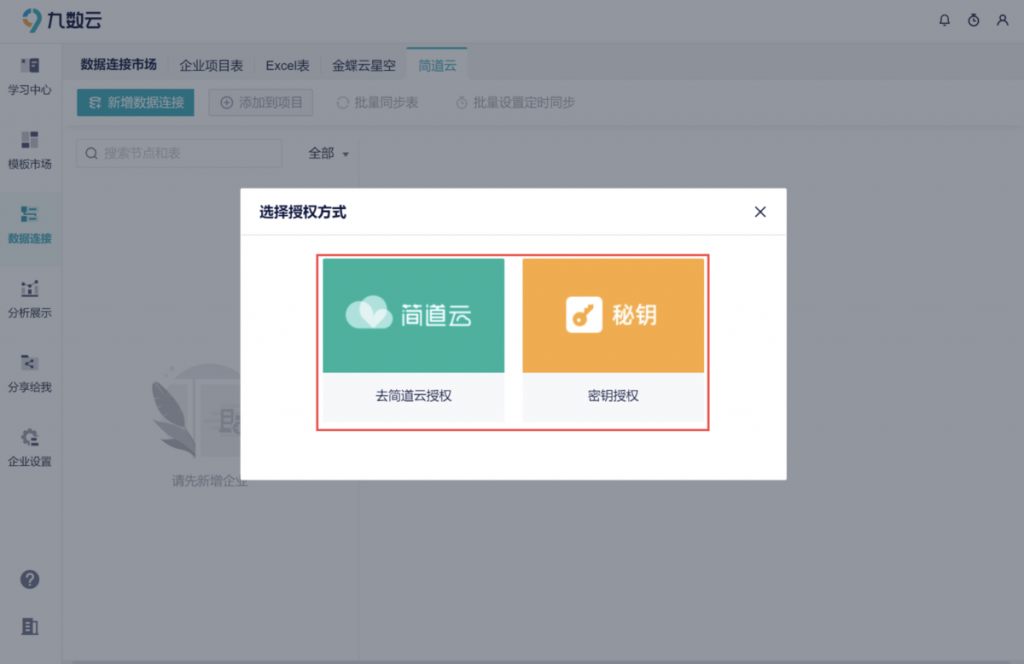 在九数云的数据连接界面选择简道云